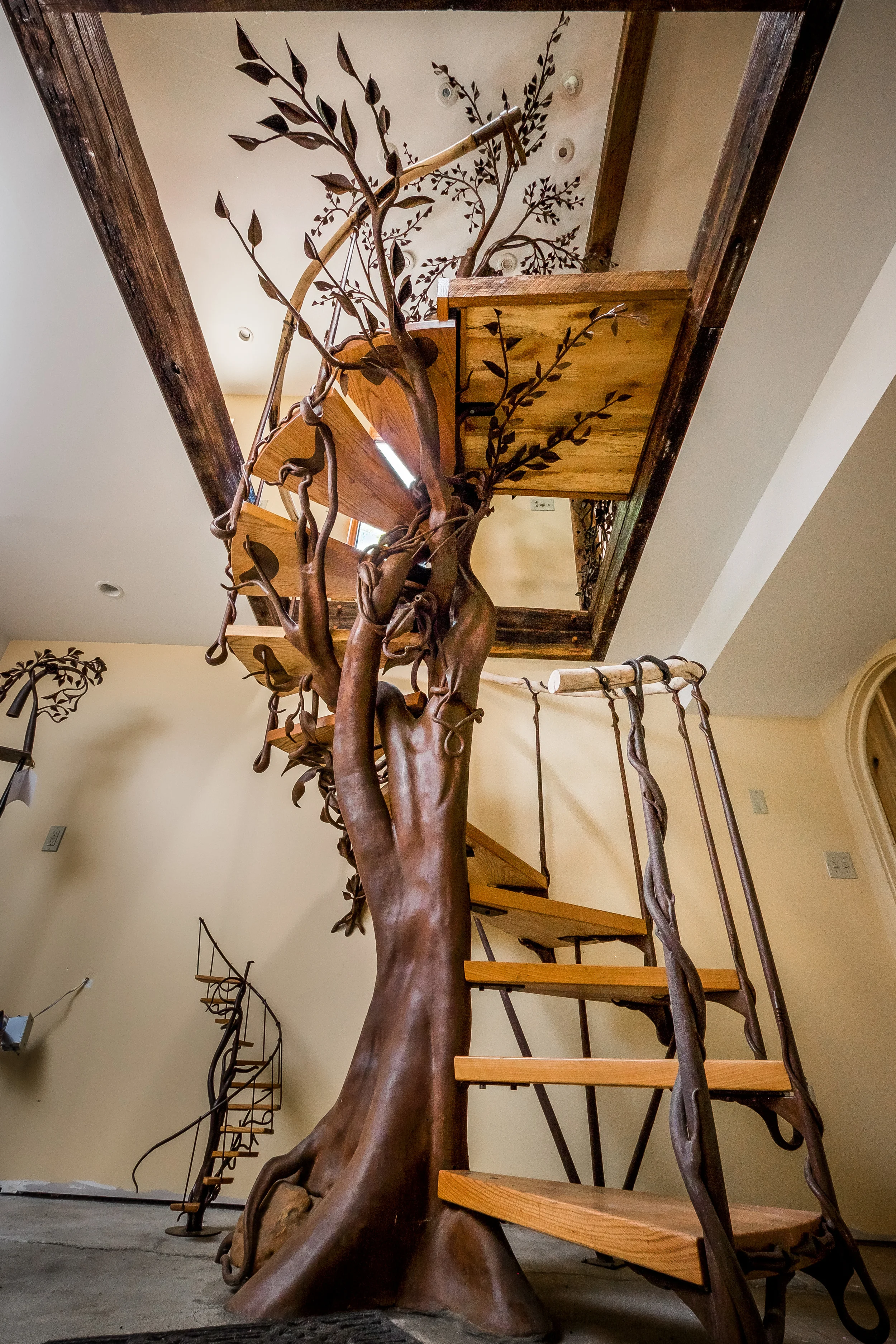 A two-story, 1400 pound forged steel spiral staircase in the shape of a tree. Each step is supported by a different branch.